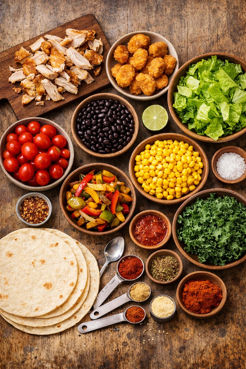 - Chicken: leftover roasted chicken, air fried nuggets, or crispy tenders sliced up