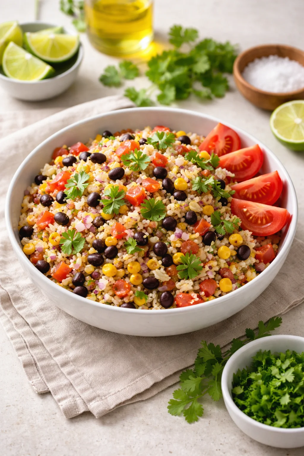 I keep it simple: cooked quinoa, black beans, corn, diced bell pepper, red onion, cilantro if I have it, and a lime dressing. Sometimes I add avocado right before eating so it stays pretty. If you want extra protein, toss in pepitas or a handful of crushed tortilla chips for crunch.