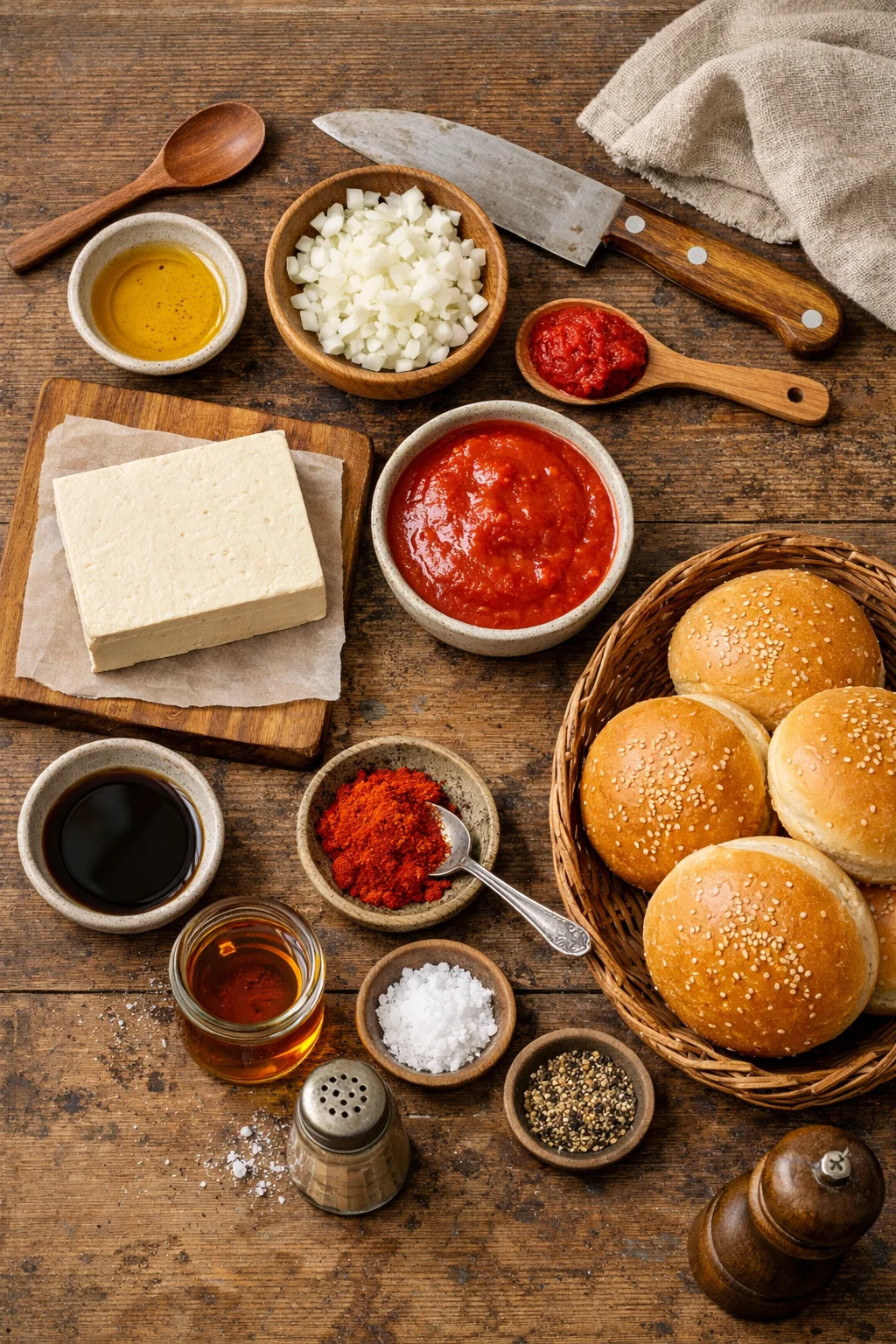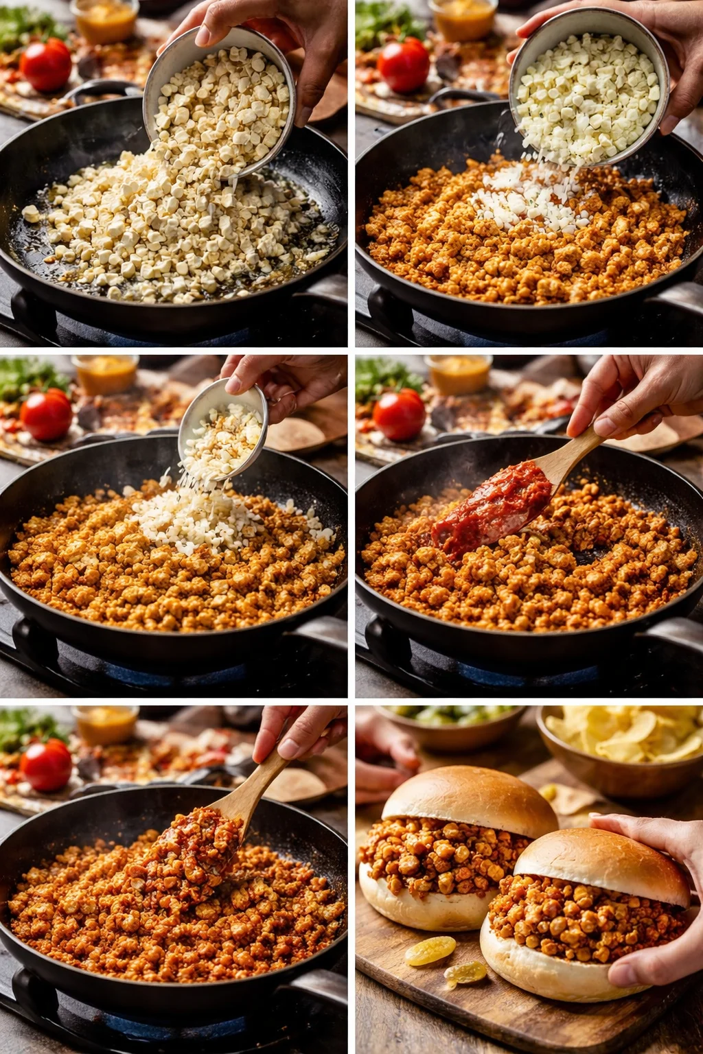 How I do it: I crumble the tofu with my hands right into a pan. No pressing if I am being honest. I cook it in oil for about 6 to 8 minutes until it looks a little browned. Then I stir in onion, ketchup, soy sauce, maple, and spices. Let it simmer for another 5 minutes so it gets thick and clingy. Pile it onto buns with pickles or coleslaw.