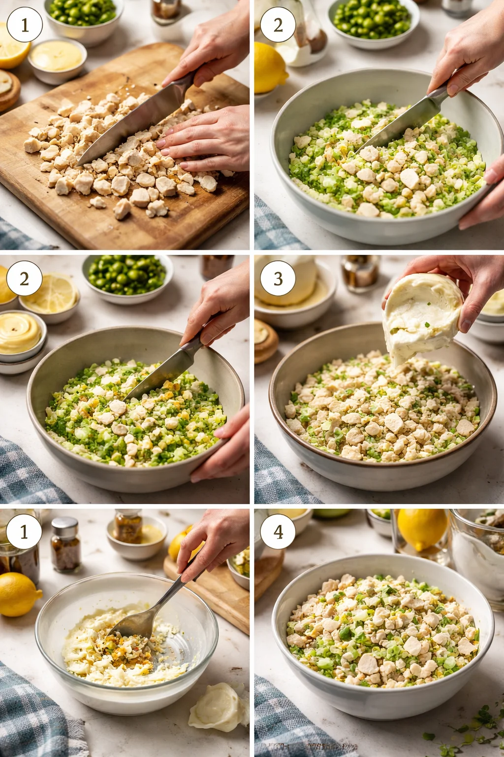 In a small bowl, stir together mayo, Dijon, lemon juice, salt, and pepper. Then pour it over the chicken mixture. This helps you avoid overdoing the mayo.