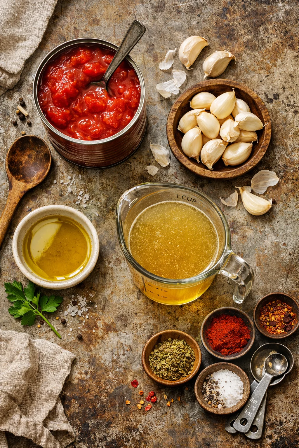 - Canned tomatoes (crushed or whole): this is the main flavor. I usually use crushed to keep it fast.
