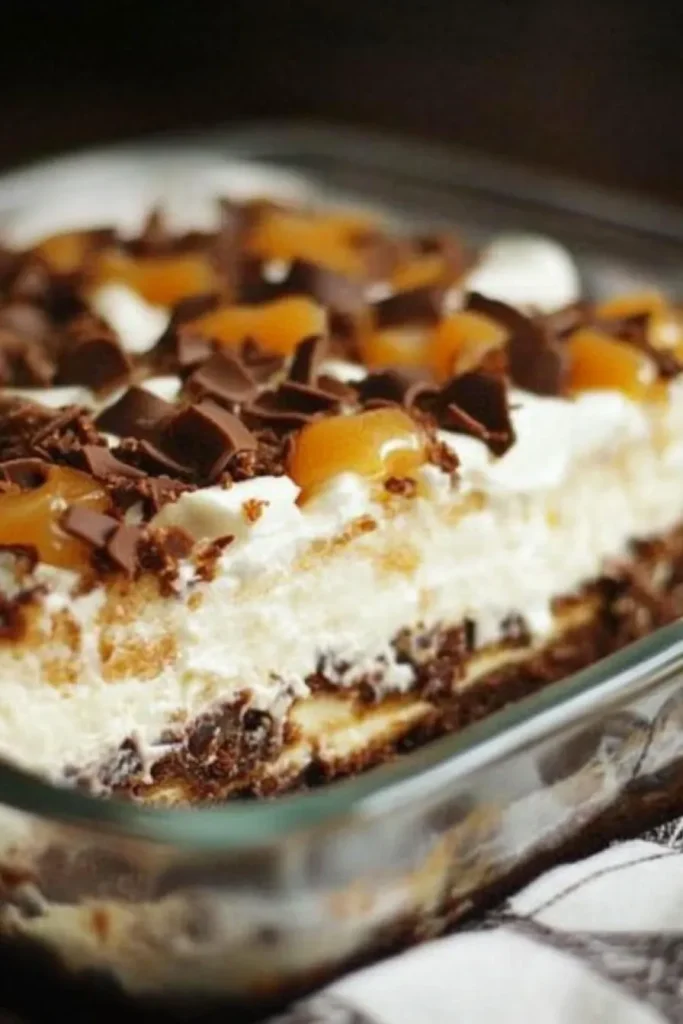Decorate with chopped Snickers bars (or your choice of candy) and drizzle more caramel on top.