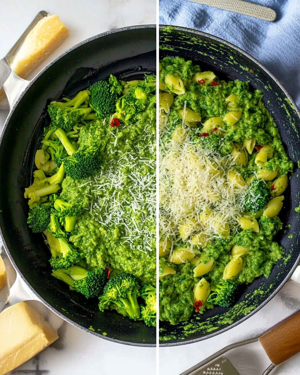 - Add pasta to the skillet with broccoli and stir in grated Parmesan. Cook for 1 more minute, adding pasta water as needed.