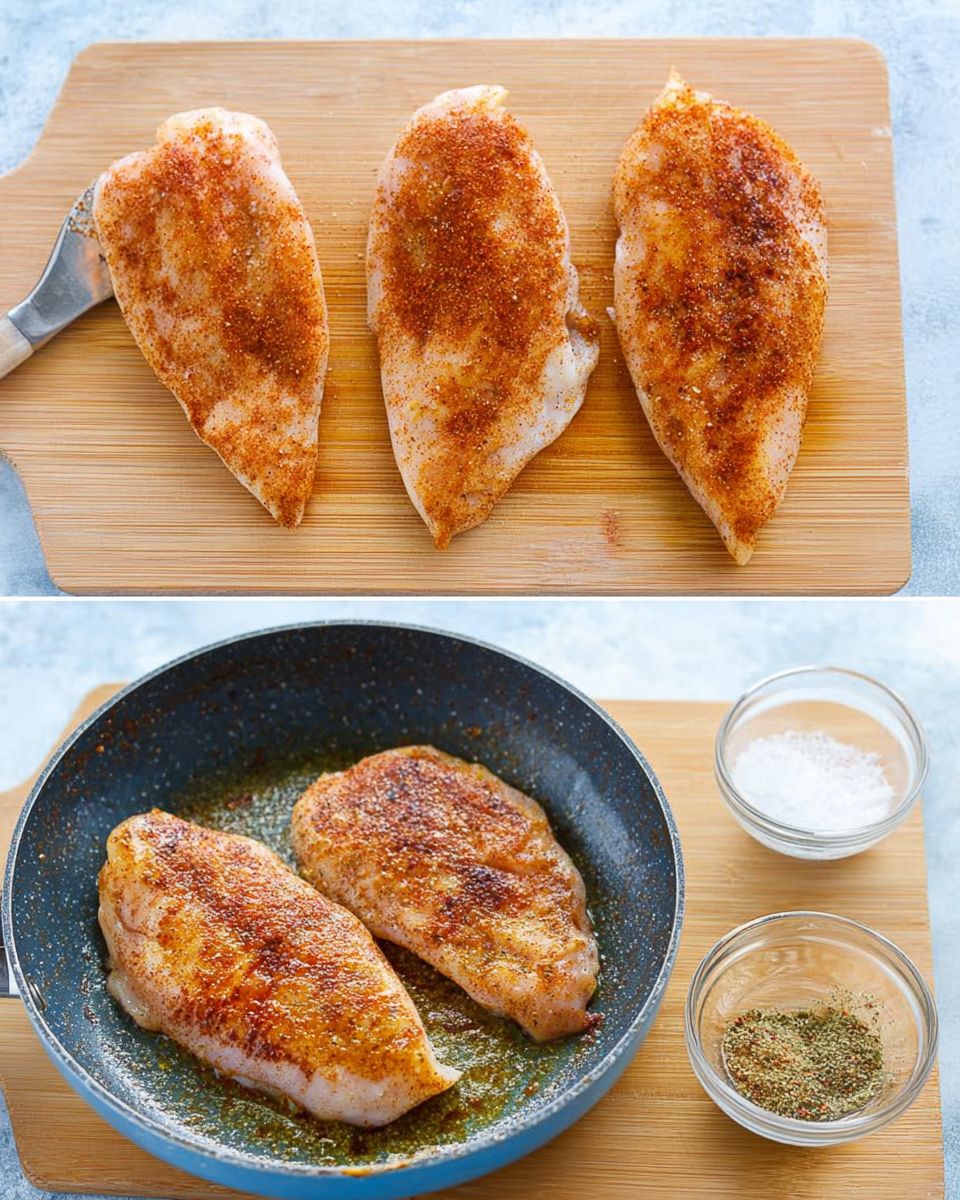 - Season the chicken fillets with salt, pepper, oregano, paprika, garlic powder, cumin, and a pinch of cayenne pepper on both sides.