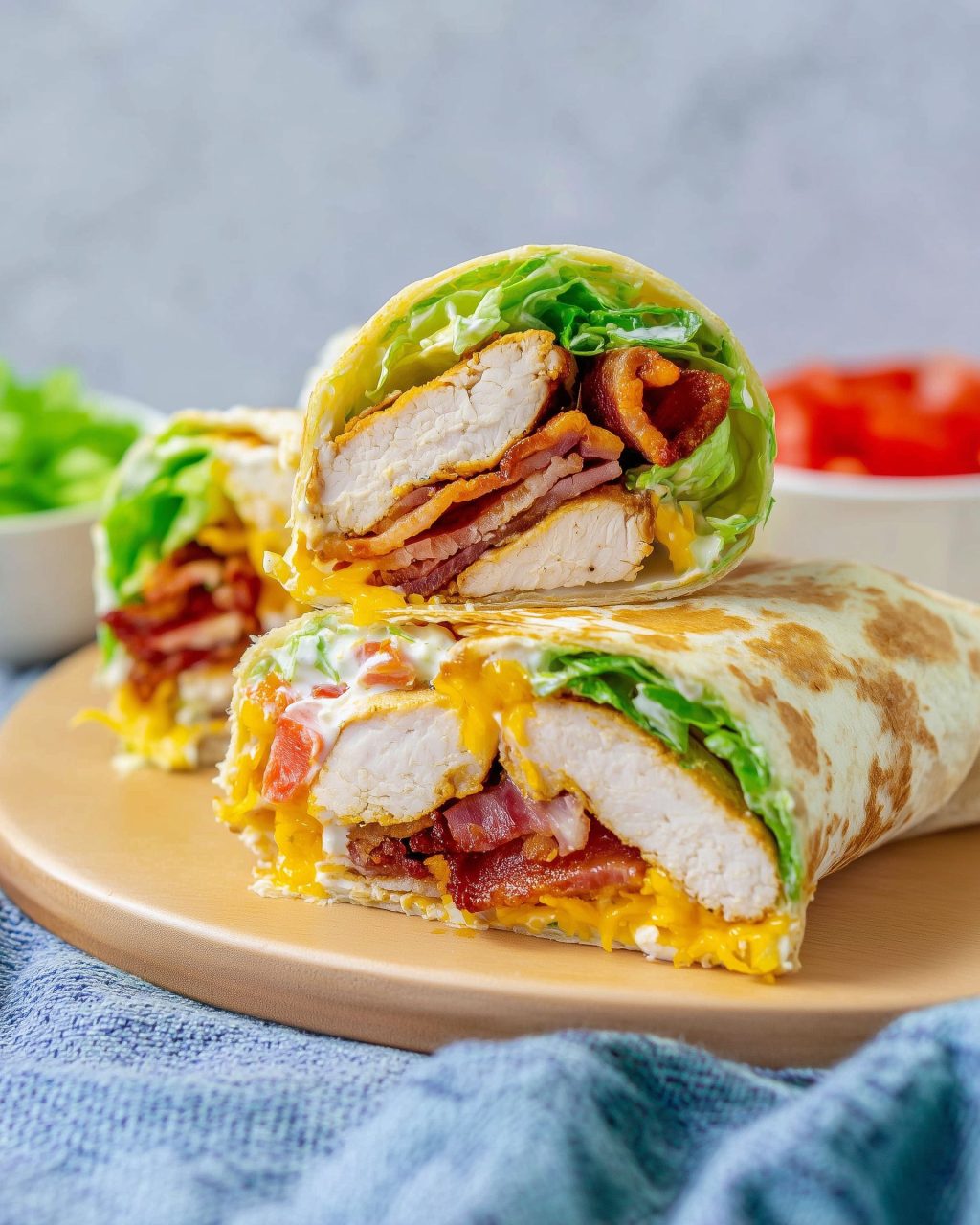 - Assemble Wraps: Place lettuce on tortillas, top with chicken, bacon, cheese, tomatoes, and ranch dressing. Wrap tightly.