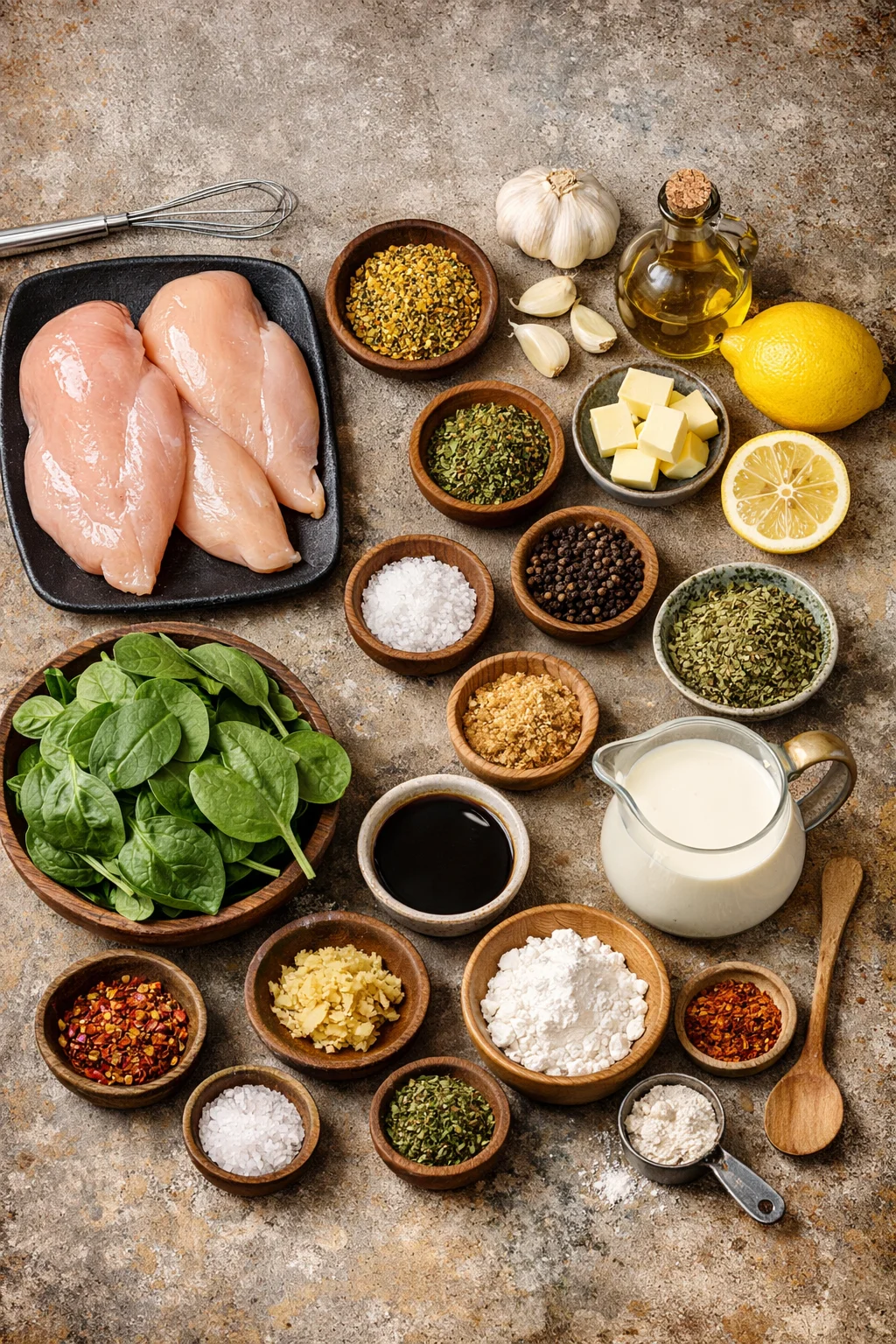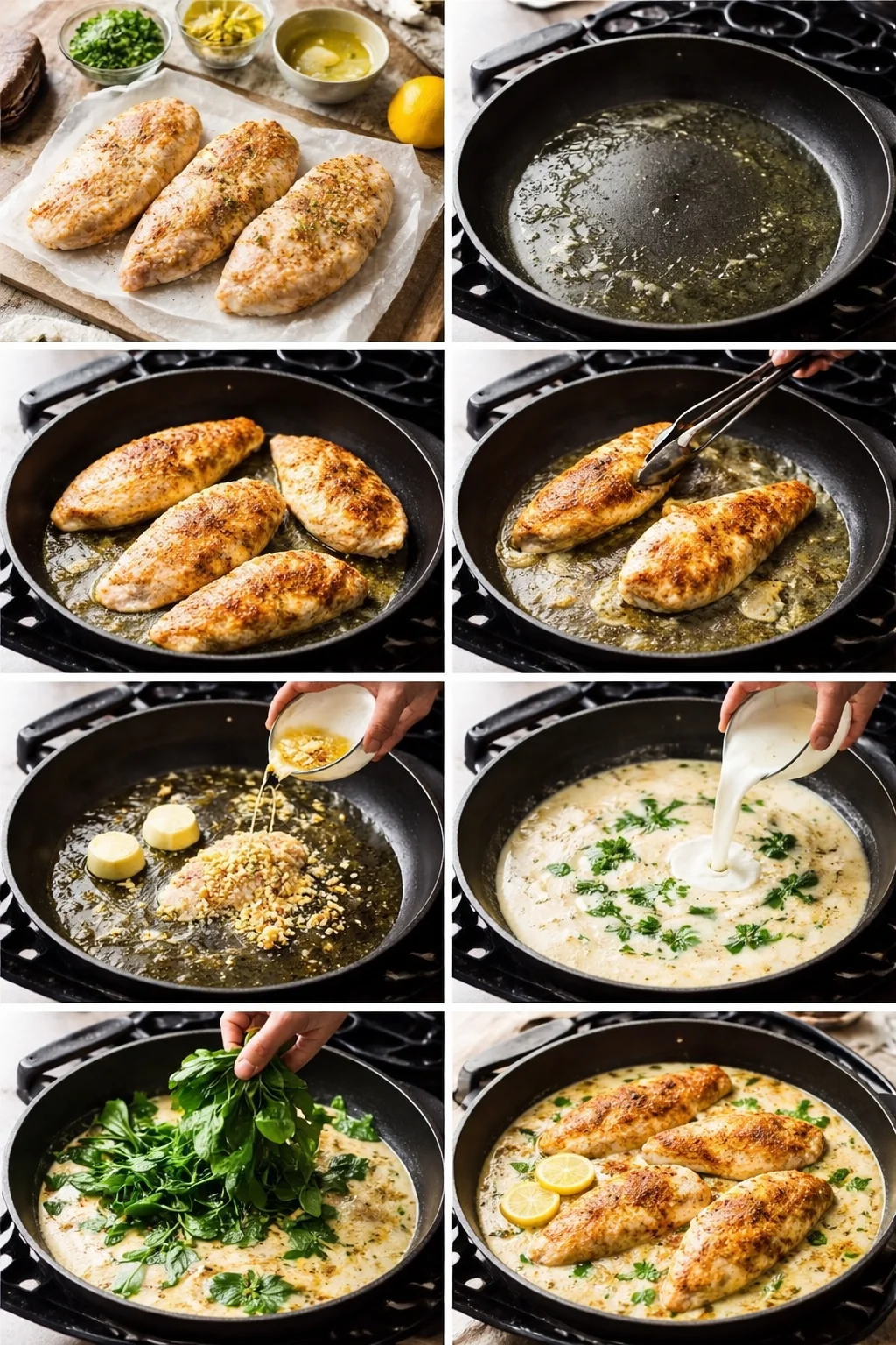 I start by seasoning thin chicken cutlets with salt and pepper, then sear them in a skillet until golden and cooked through. I take them out, then in the same pan I add a little more butter and garlic. Next comes a splash of chicken broth and a bit of cream, then I stir in parmesan. Once it thickens slightly, I throw in a big handful of spinach and let it wilt. Chicken goes back in, everything gets coated, and dinner is basically done.