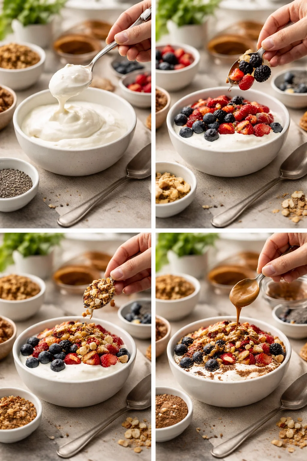 I like to think of it like building a balanced plate, just in a bowl. You want a base that has protein, then toppings that bring color, crunch, and flavor. If you need a more filling day, add more fat and fiber like nut butter and chia seeds. If you need something lighter, go heavier on berries and lighter on granola.