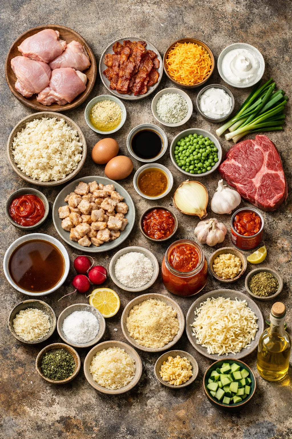 I start by heating a big skillet and adding a little oil. Then I cook the cauliflower rice first, all by itself, and let it sit long enough to dry out a bit. After that I push it to the side and scramble a couple eggs. Then I toss in cooked chicken, shrimp, or even leftover pork. Finish with soy sauce or coconut aminos, a little sesame oil, and a handful of frozen peas and carrots if you can fit them into your macros.