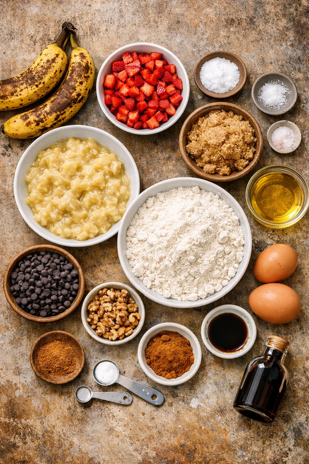 I keep this recipe simple on purpose. No fancy mixers required, and you can do most of it with one bowl and a spoon. The biggest thing is using ripe bananas and strawberries that taste like something. If your strawberries are pale and watery, the loaf will still bake, but the flavor will not pop the same way.