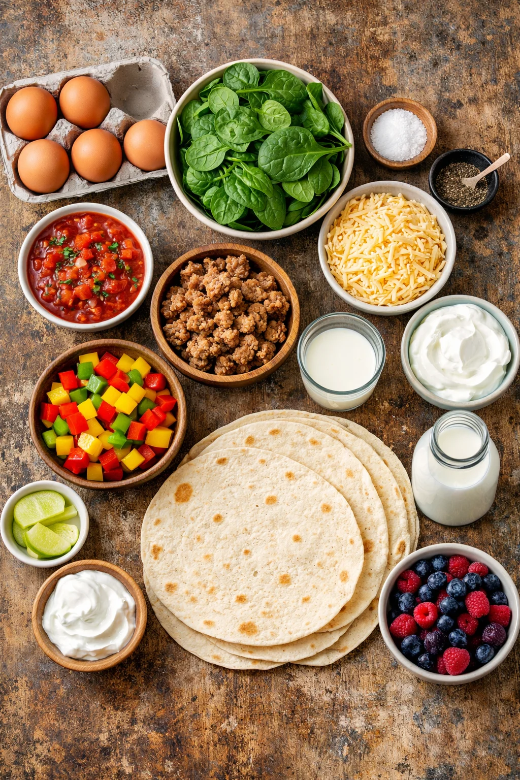 I scramble the eggs in a pan with salt and pepper. When they’re almost done, I toss in the spinach just until it wilts. Then I lay out tortillas, add egg mixture, sprinkle cheese, and roll them up tight. Wrap each burrito in foil or parchment, then pop them into a freezer bag.