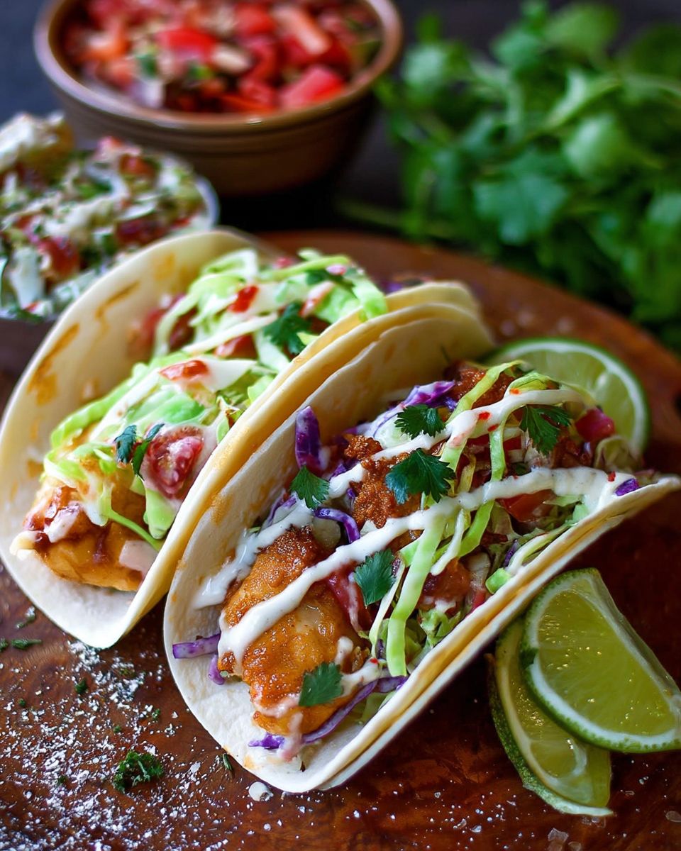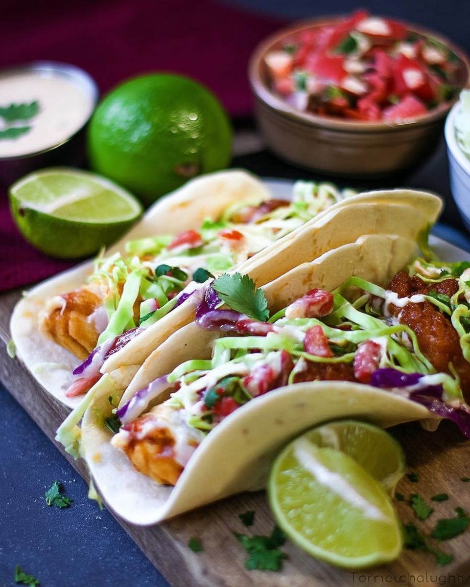 - Assemble Tacos: Warm tortillas. Divide 3–4 fish cubes per tortilla. Drizzle with cumin honey, then top with cabbage, pico de gallo, chipotle ranch, cilantro, and a squeeze of lime.