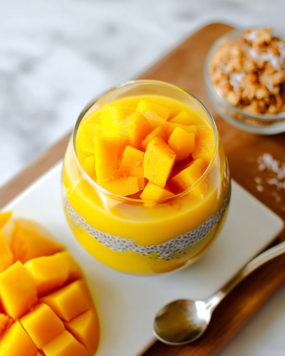 - Layer & Serve: In serving glasses, alternate spoonfuls of chia pudding and mango puree. Top with extra coconut, mango cubes, or granola. Enjoy!