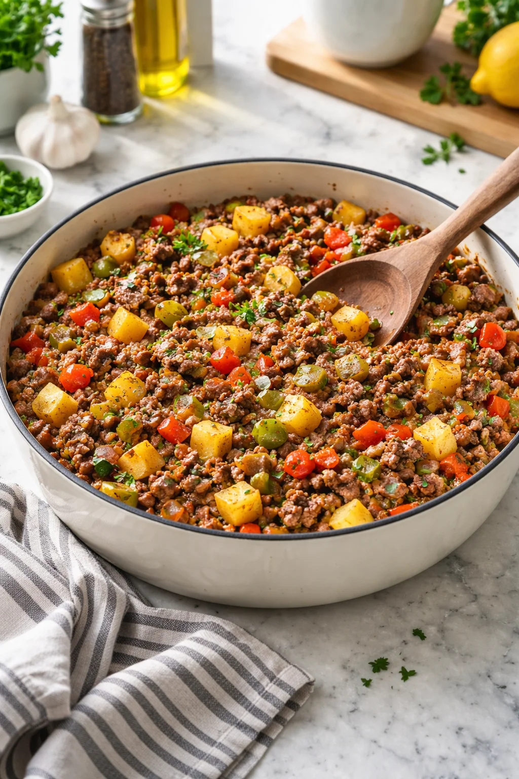 Here is my simple method: brown the beef and onion, then stir in ketchup, a little mustard, a tiny bit of brown sugar, and a splash of vinegar or pickle juice. Add salt and pepper, then simmer it for 10 minutes so it thickens. That is it. If you want to sneak in veggies, finely chopped bell pepper disappears nicely.