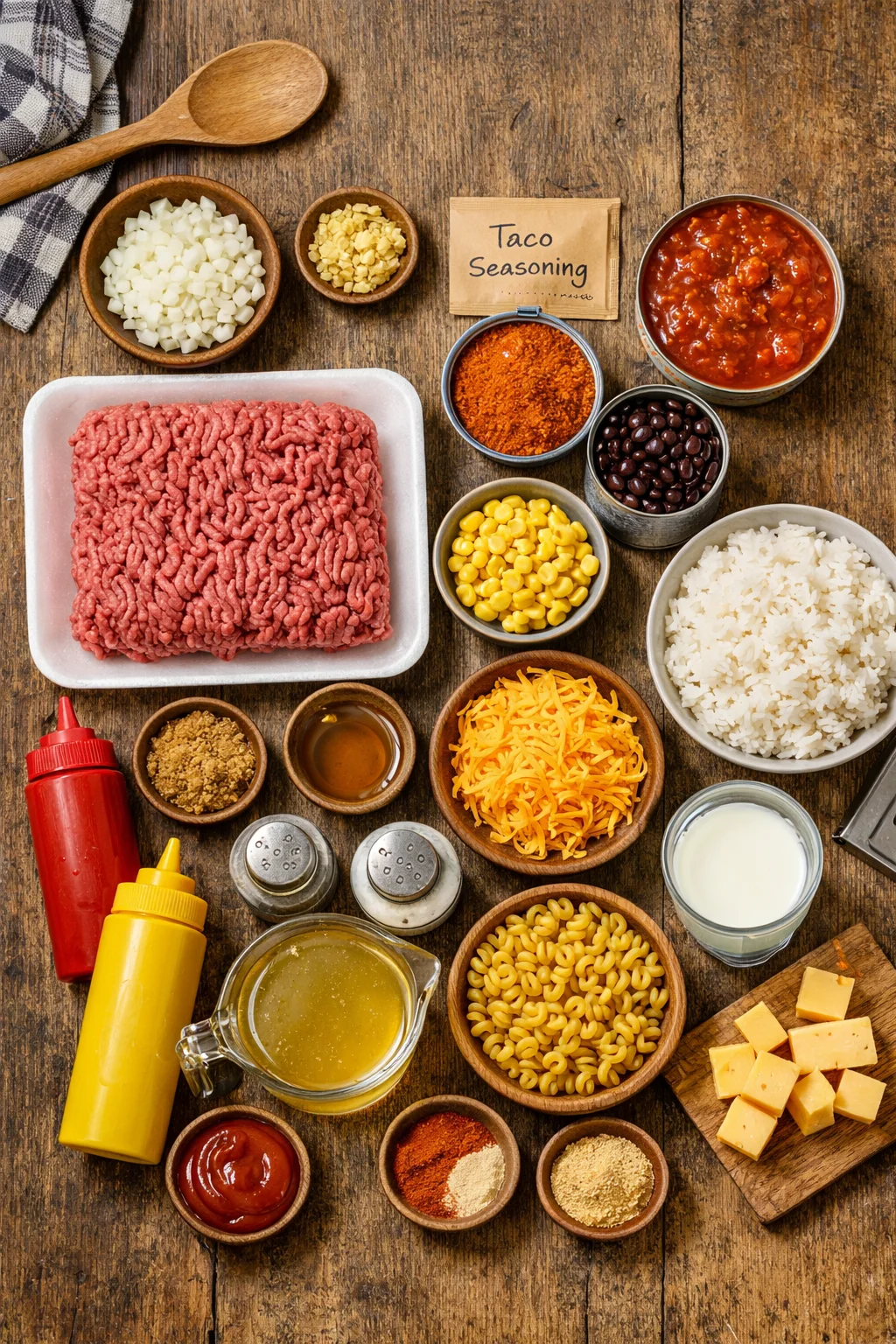 Brown the beef with the onion, then stir in garlic and taco seasoning. Add salsa, beans, and corn, and let it simmer for a few minutes so it thickens up. If you already have rice cooked, stir it in and warm it through. If you are cooking rice right in the skillet, add the dry rice and the water listed on the package, cover, and simmer until tender. Then turn off the heat, blanket it with cheese, and cover for a minute so everything melts.