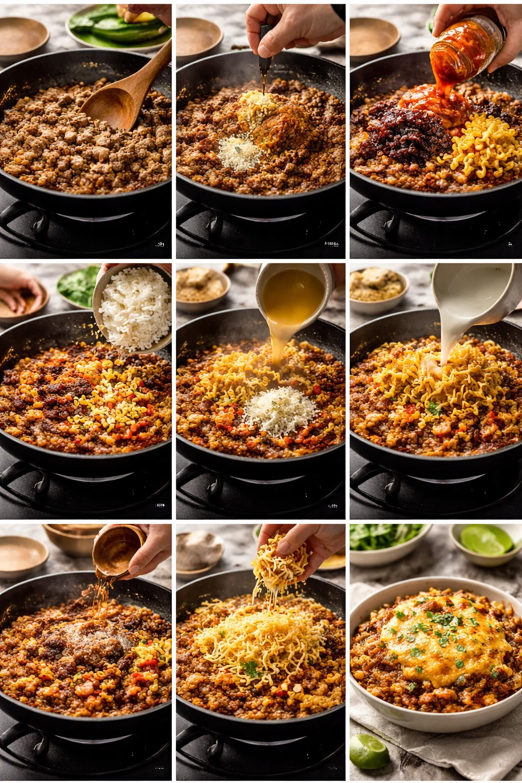 Cook ground beef with onion, add taco seasoning, then stir in a can of tomatoes and green chilies plus a cup of cooked rice. Spread it out in an oven safe skillet or baking dish, then top with a generous layer of cheese. Bake at 400 F for about 10 to 15 minutes until the cheese is melted and a little golden. If you like extra browning, broil for 1 to 2 minutes, but stay close because it can go from perfect to scorched fast.